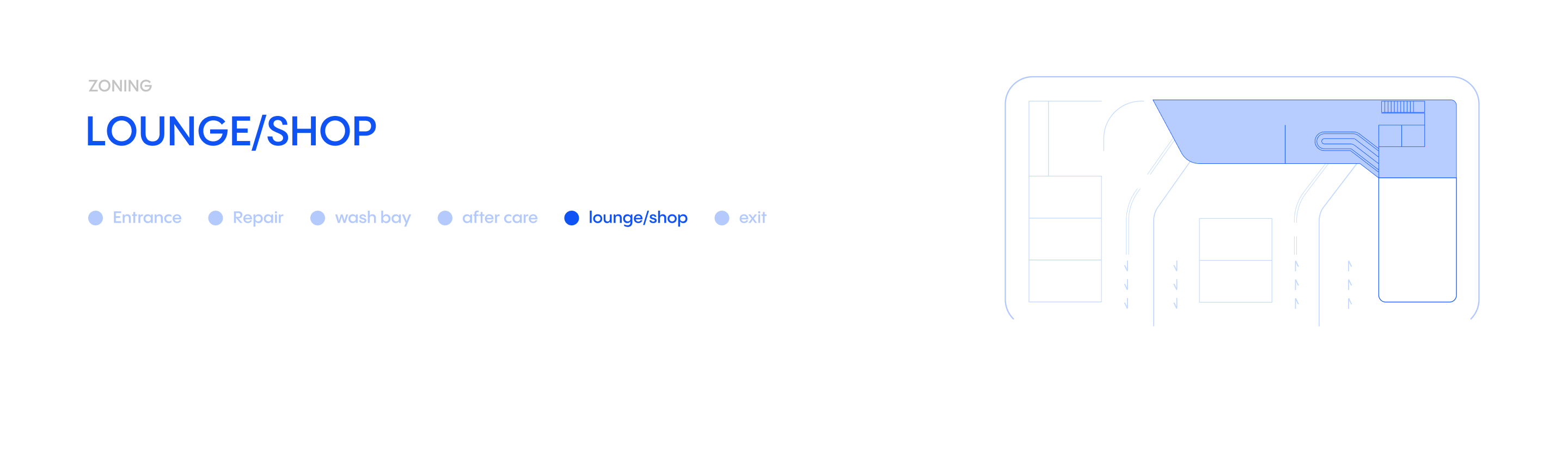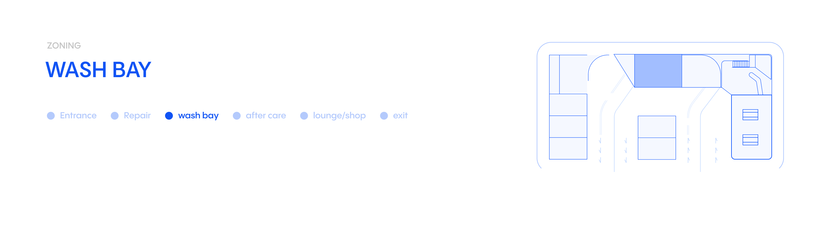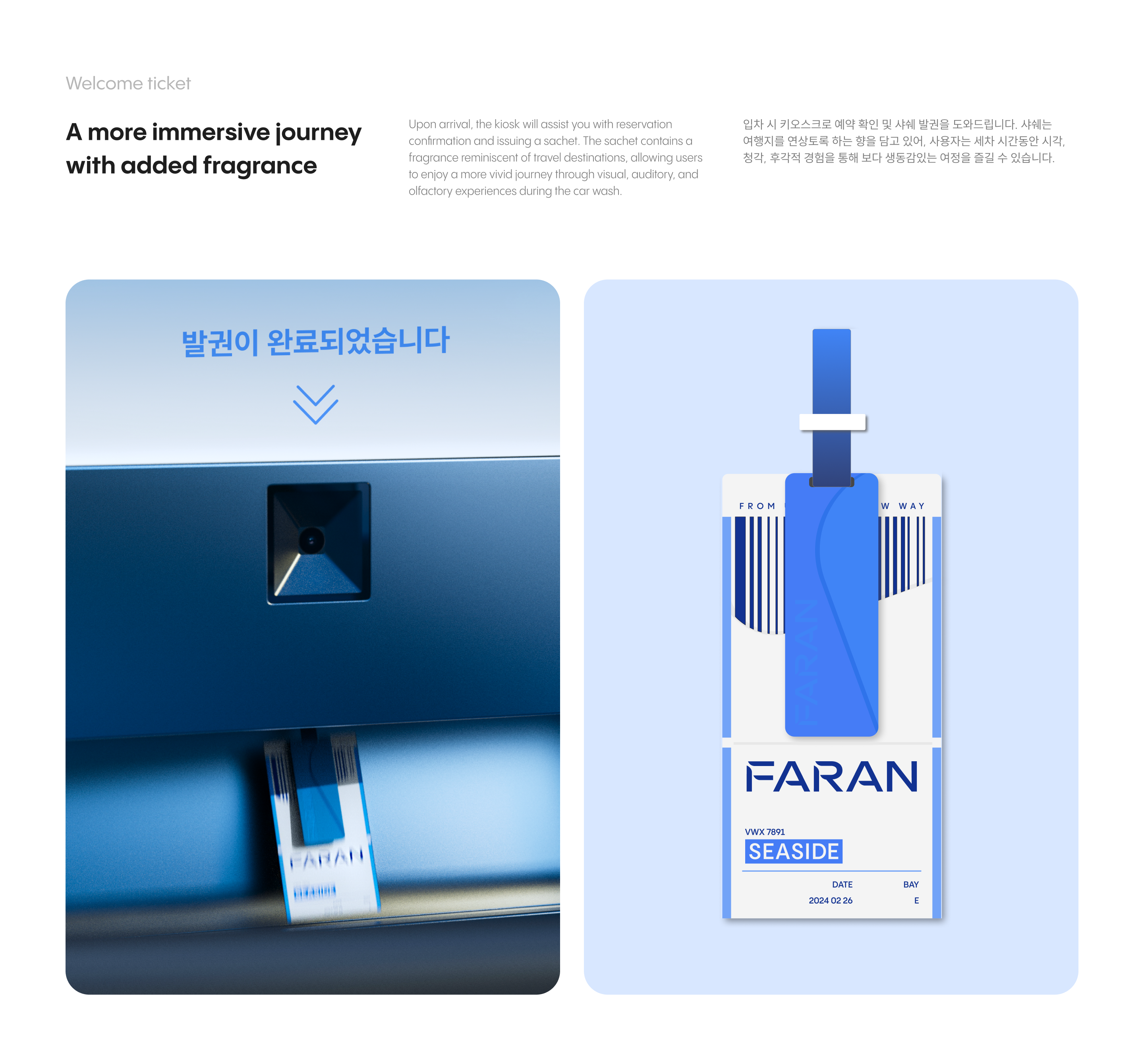 In the dense heart of the city, office workers are often exhausted by heavy traffic and endless waiting. addresses this urban fatigue by offering an affordable yet premium car wash experience, even within limited city spaces. Inspired by airport logistics, provides a fast and refreshing "car wash journey." By adapting airport systems to maximize space efficiency and turnover rate, we deliver an integrated brand experience that leaves customers feeling as if they have just returned from a revitalizing trip.