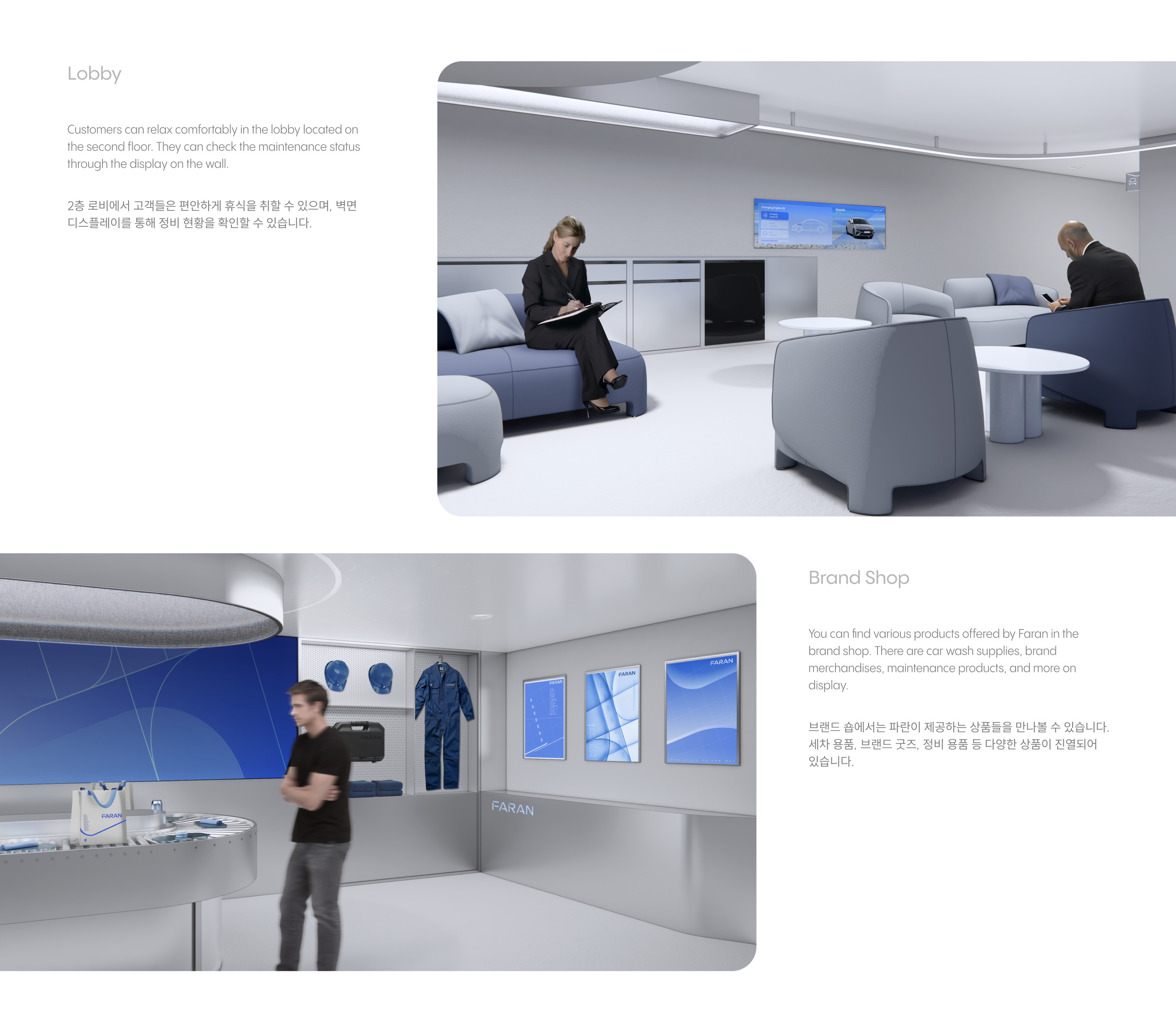 복잡한 도심 속 직장인들은 극심한 교통체증과 긴 기다림에 지쳐 있습니다. <파란>은 이러한 도시의 피로를 해결하기 위해, 협소한 공간에서도 합리적인 가격으로 프리미엄 세차 경험을 제공합니다. 공항을 모티프로 설계된 <파란>의 세차 프로세스는 공항의 체계적인 시스템을 차용하여 공간 효율과 회전율을 극대화했습니다. 단순한 세차를 넘어, 일상 속에서 잠시 여행을 다녀온 듯한 감각적이고 통합적인 브랜드 경험을 선사합니다.