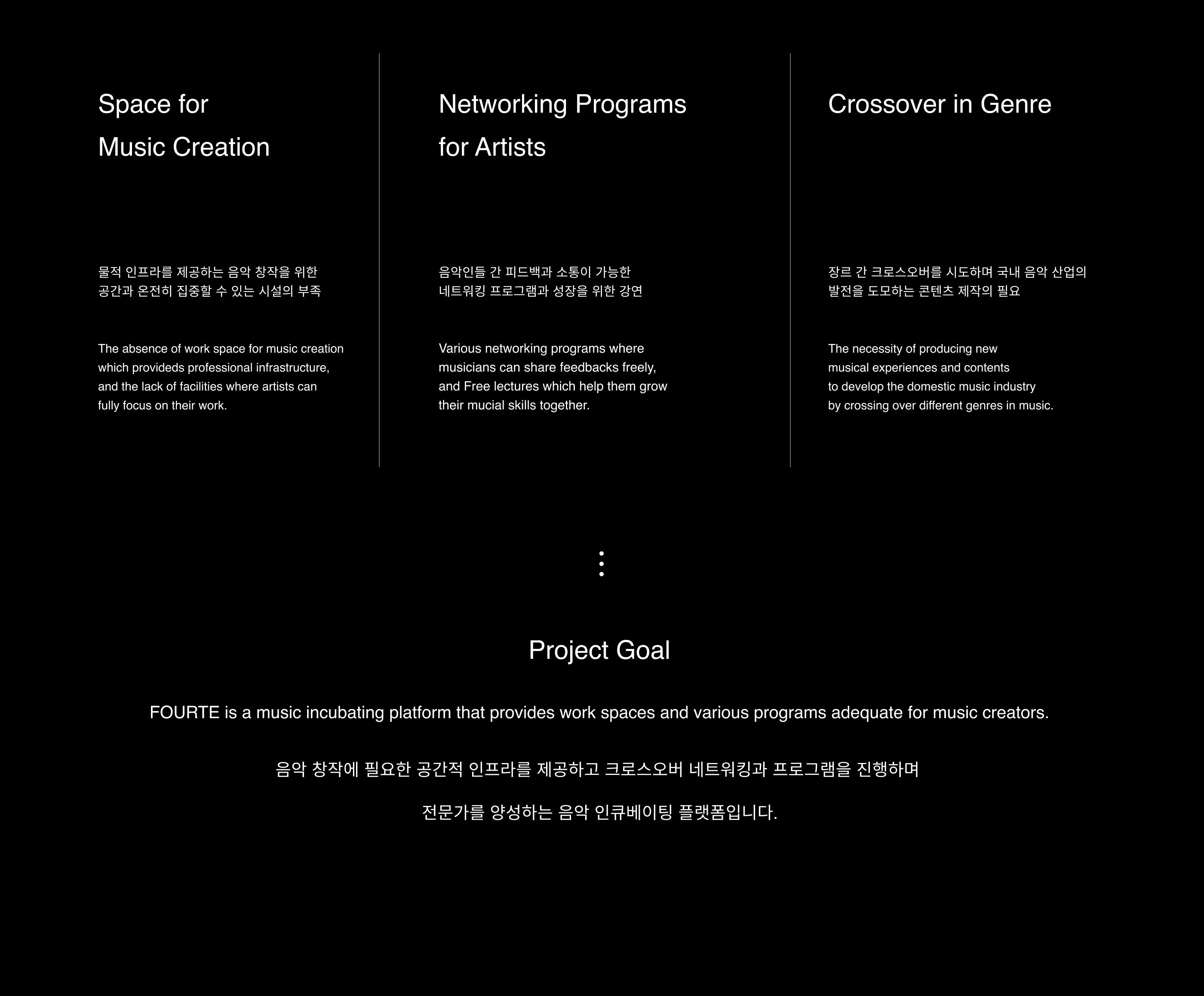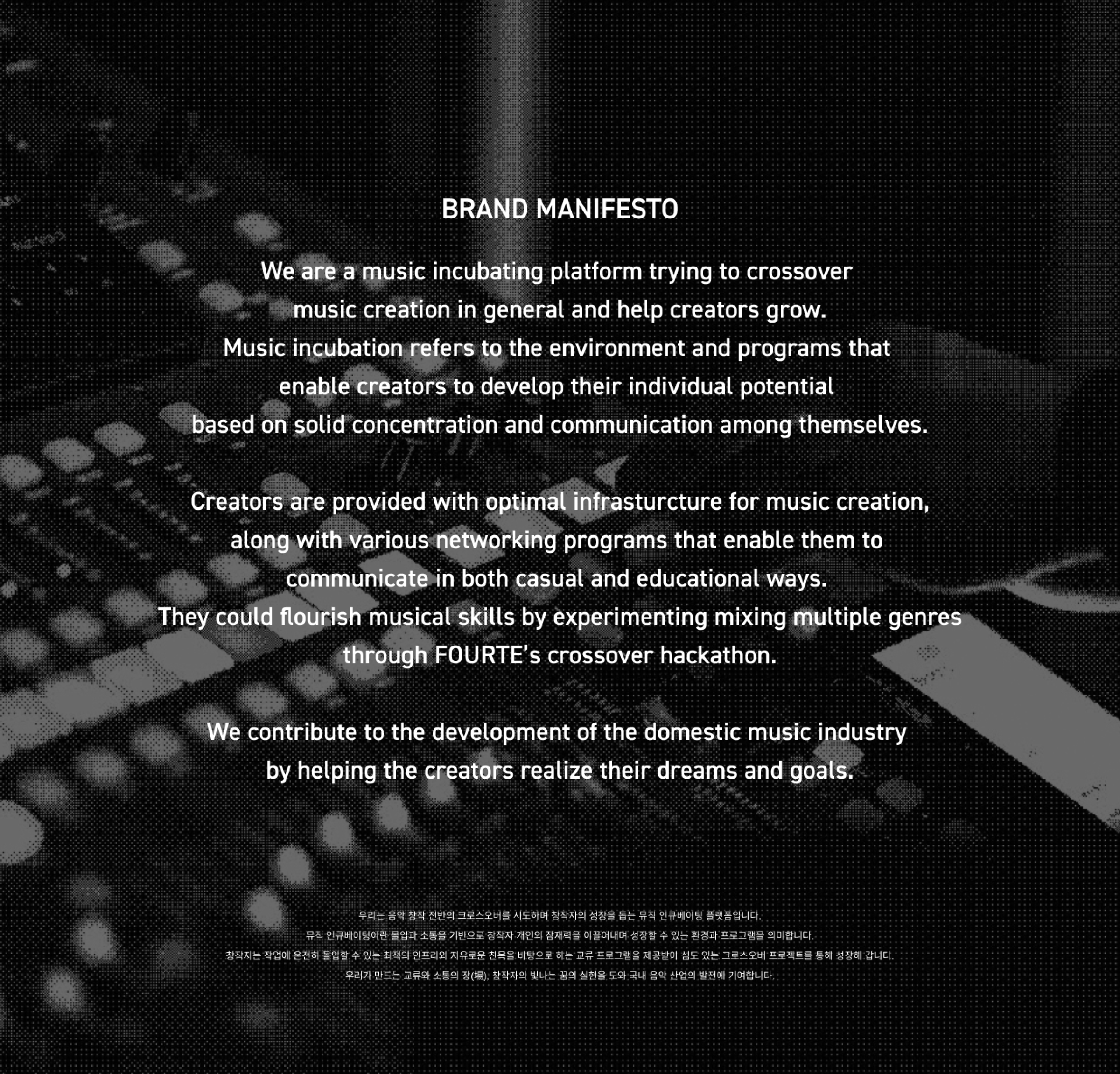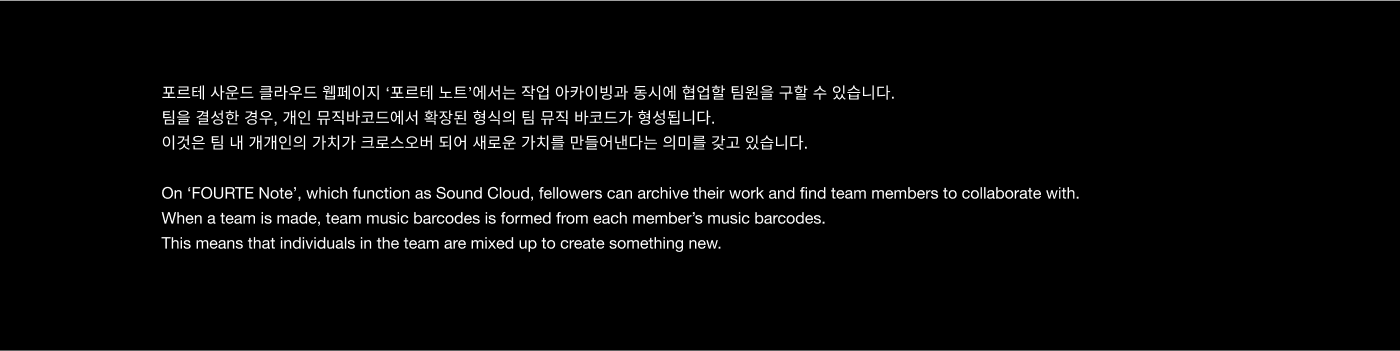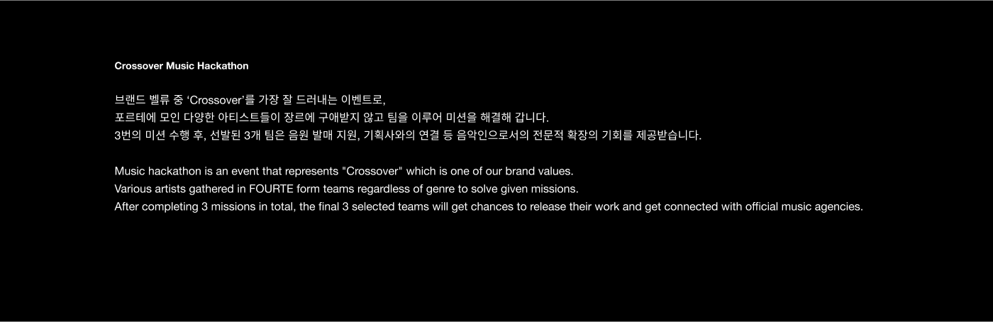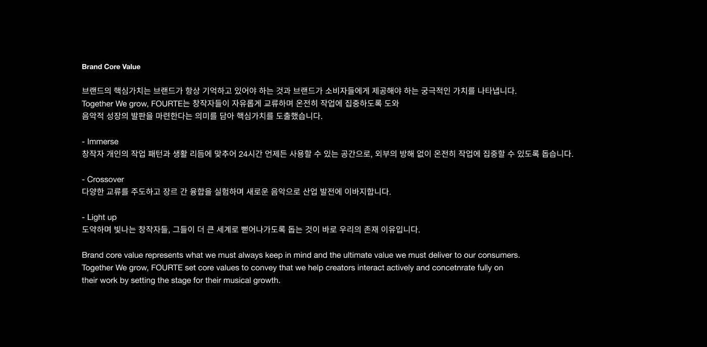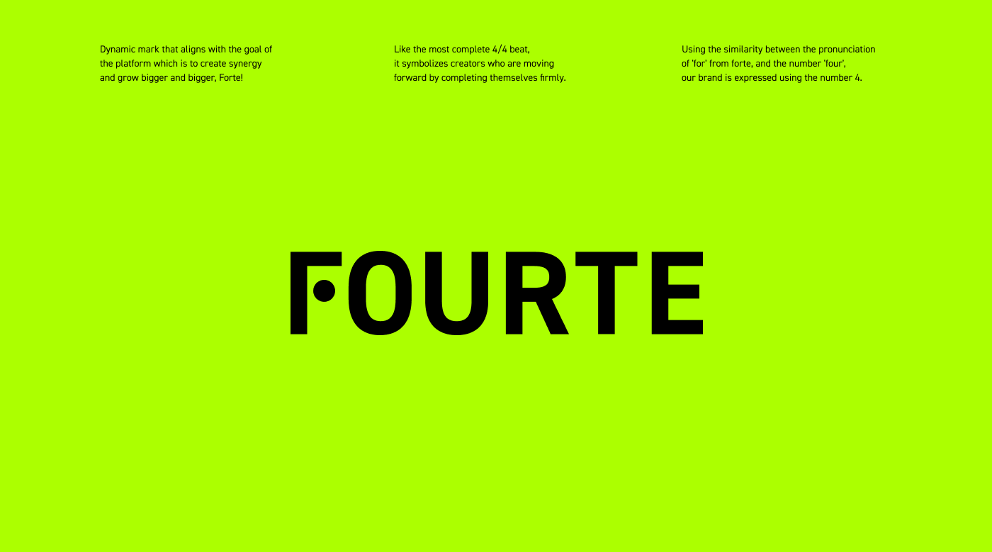 FOURTE is a music incubating platform that empowers creator growth through boundary-breaking crossover experimentation. By providing a flexible networking environment, the platform fosters a community where creators collaborate on in-depth projects. Inspired by the musical term 'Forte'—representing increasing intensity—the brand identity utilizes the structural logic of musical notation to visualize the powerful synergy created when people, music, and space converge.