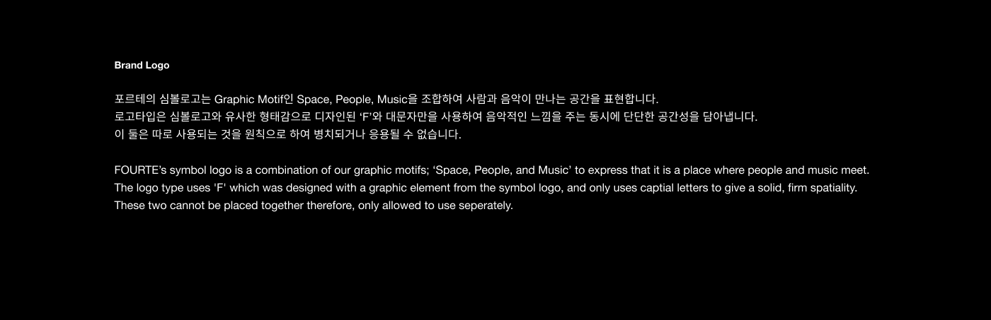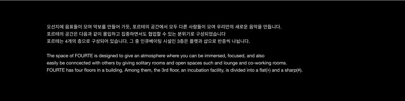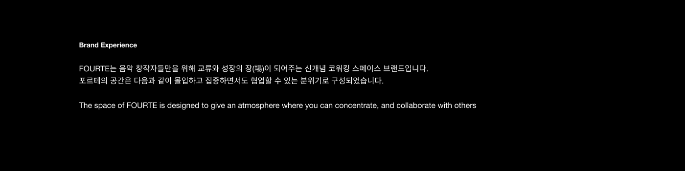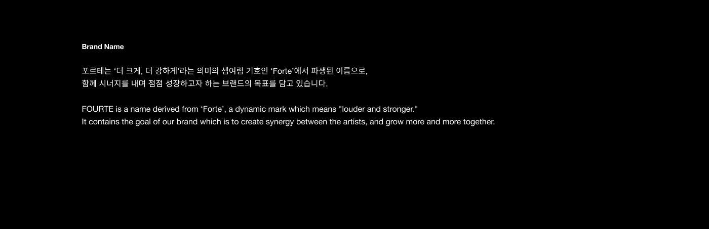 FOURTE는 음악 창작의 경계를 허무는 크로스오버를 시도하며, 창작자의 지속적인 성장을 지원하는 뮤직 인큐베이팅 플랫폼입니다. 유연한 네트워크 프로그램을 통해 창작자들이 교류하고 협업하며, 심도 있는 프로젝트를 완성해 나가는 상생의 커뮤니티를 지향합니다. '점점 세게'를 의미하는 음악 기호 포르테와 음악 기보법의 조형 원리를 차용하여, 사람과 음악, 그리고 공간이 만나 일으키는 강력한 시너지를 브랜드 아이덴티티에 담아냈습니다.