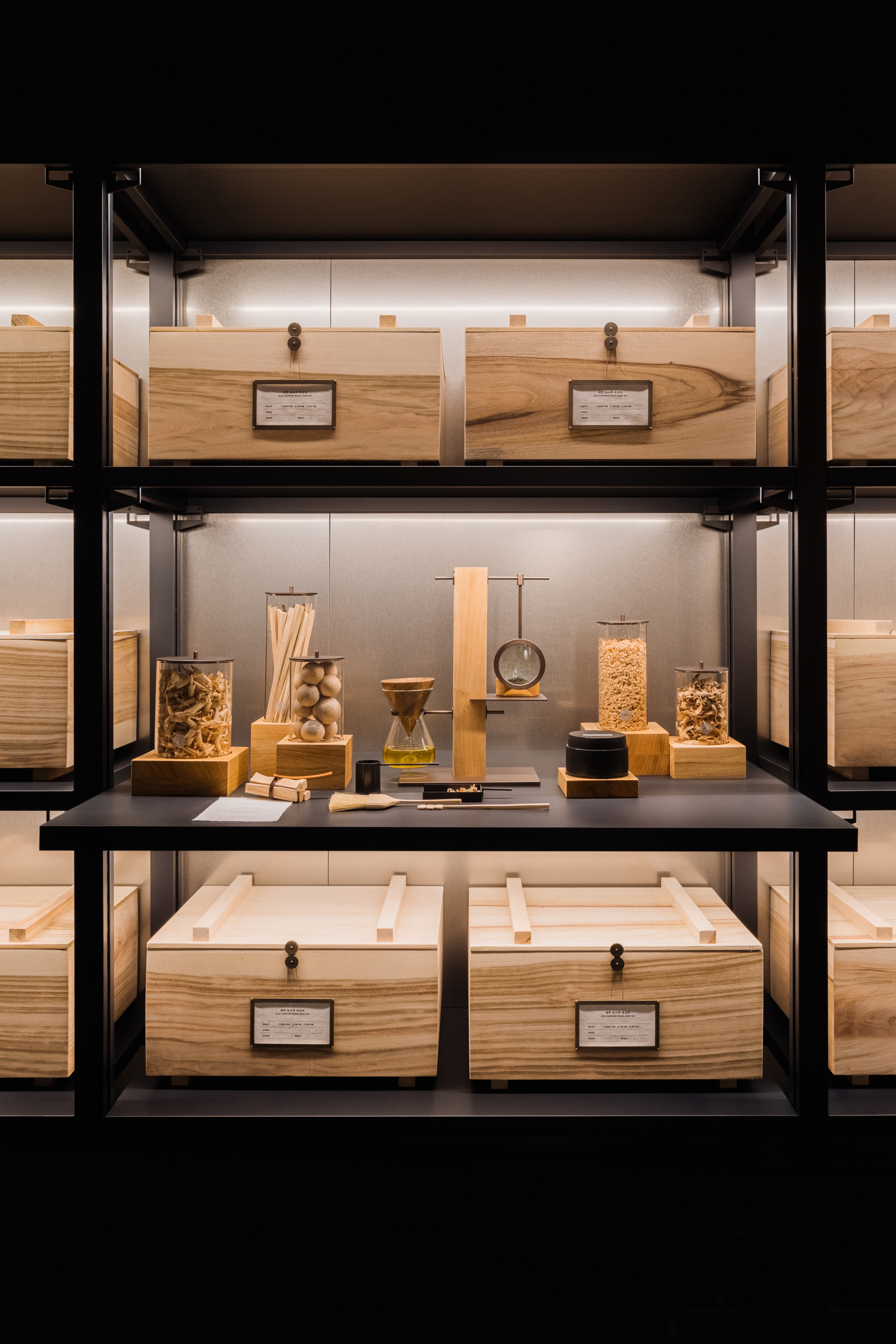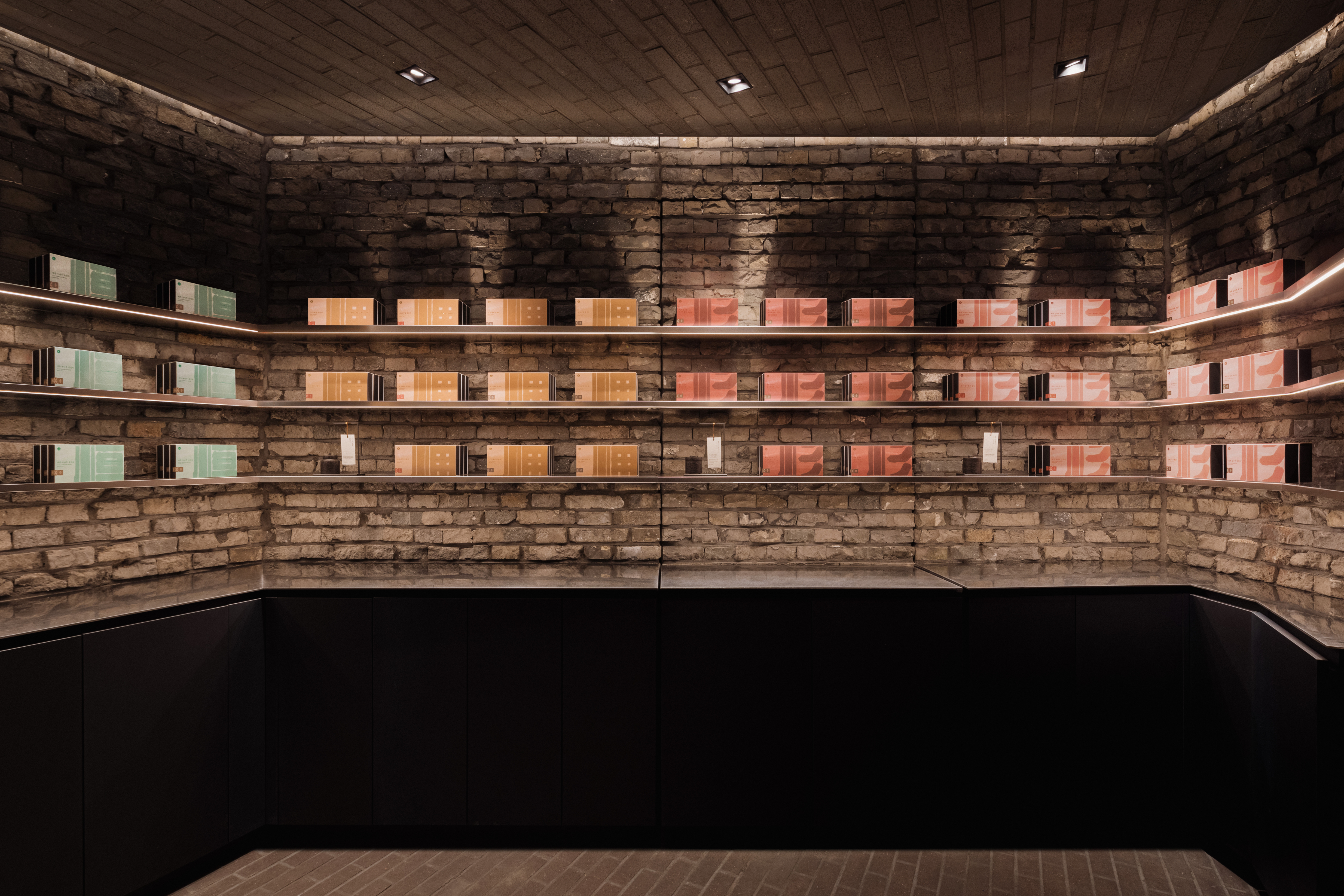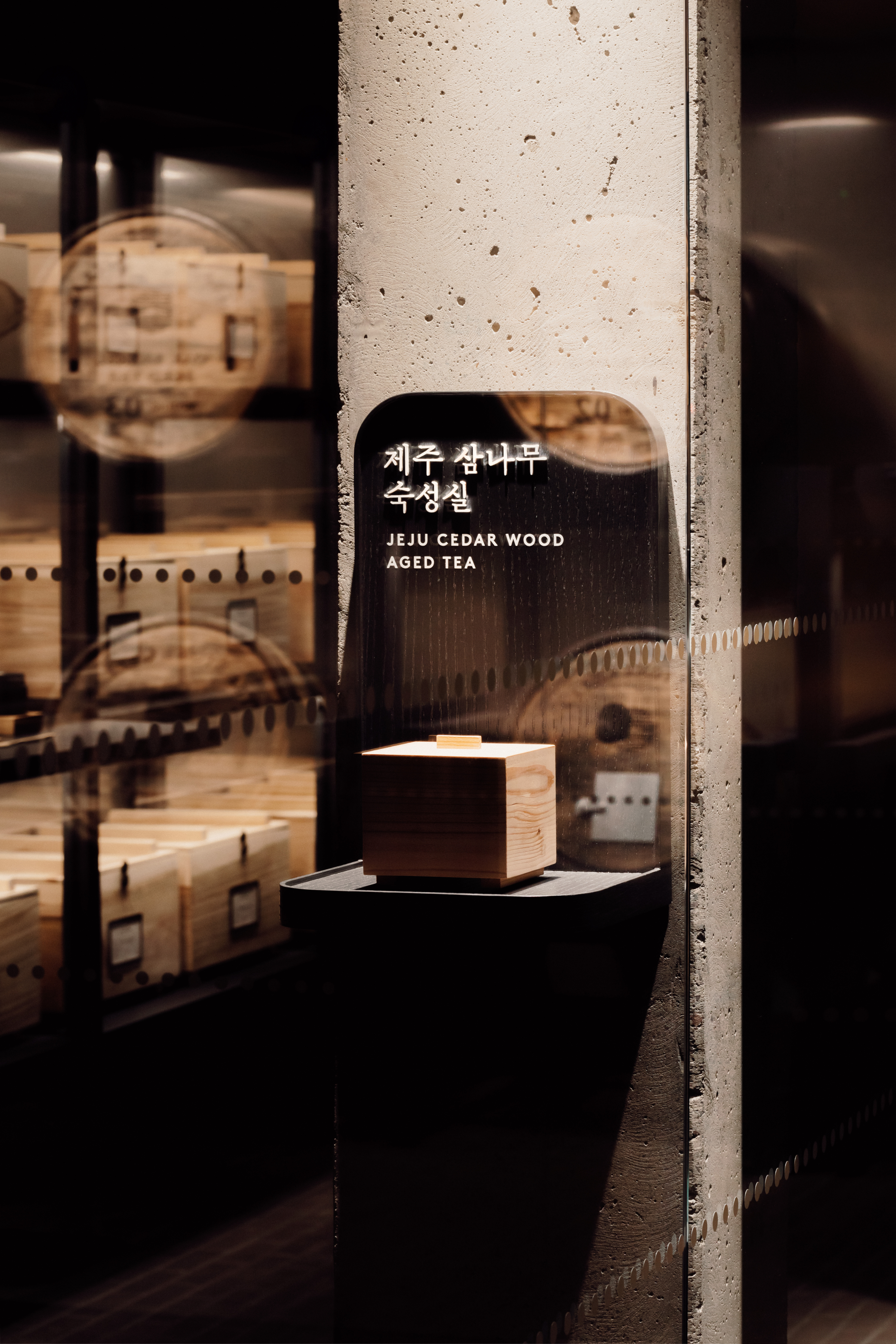 오설록 티스톤 셀러는 제주의 자연과 인고의 시간이 만나 차가 깊어지는 과정을 담아낸 차 숙성 공간입니다. '벼루가 되어가는 서사'를 품은 티스톤의 하층에 위치하여, 어둠과 온기 속에서 차가 완성되는 신비로운 분위기를 연출합니다.