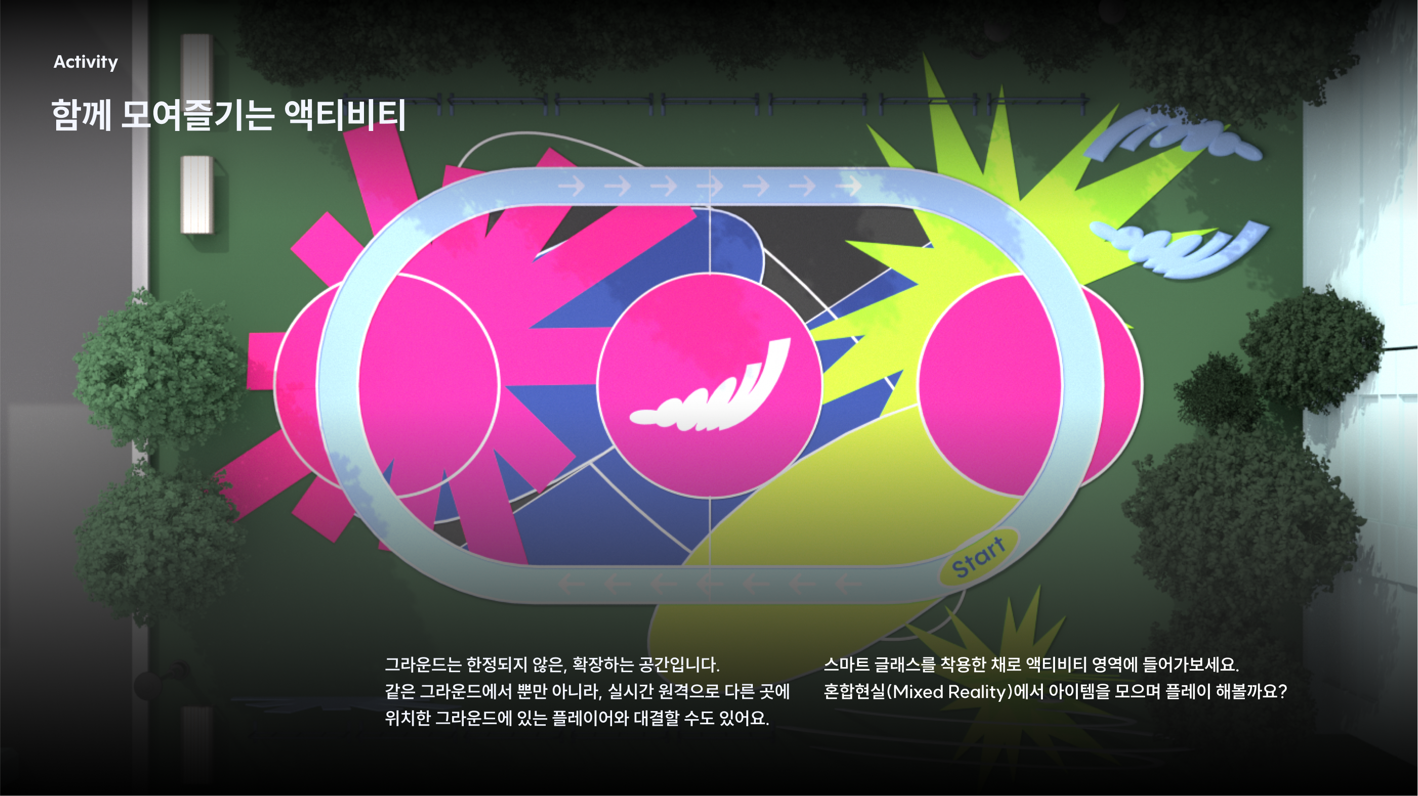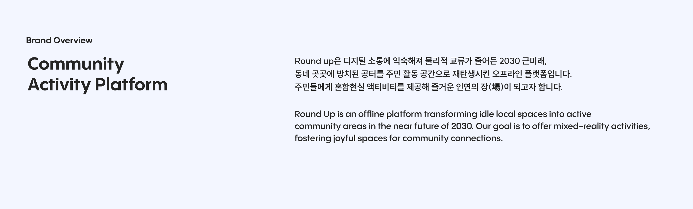 Round-Up은 우리가 살고 있는 익숙한 동네를 새로운 놀이터로 재탄생시키는 XR(확장 현실) 기반의 동네 액티비티 플랫폼입니다. '흩어져 있는 것들을 하나로 불러 모으다'라는 의미의 이름처럼, 지역 사회의 다양한 즐길 거리와 사람들을 기술을 통해 연결하는 것을 목표로 합니다.