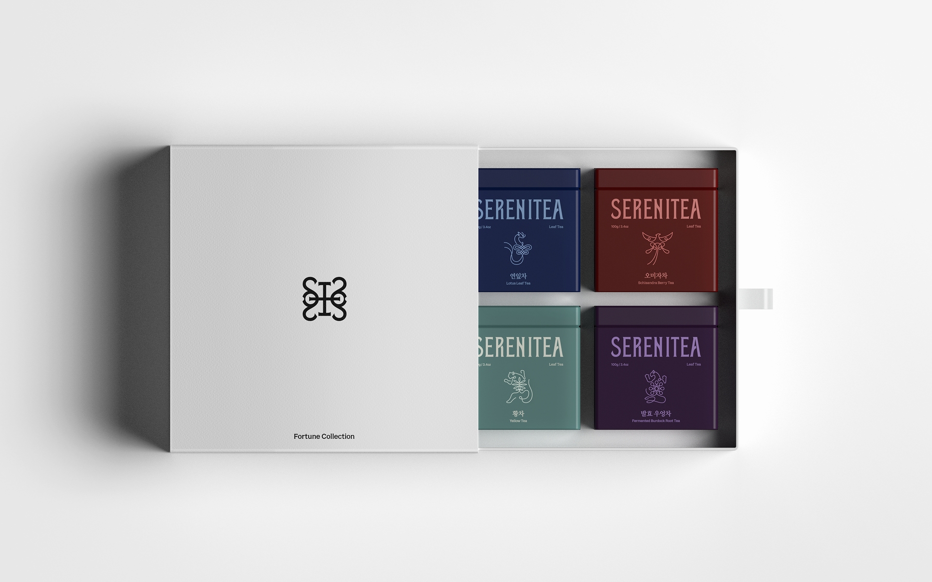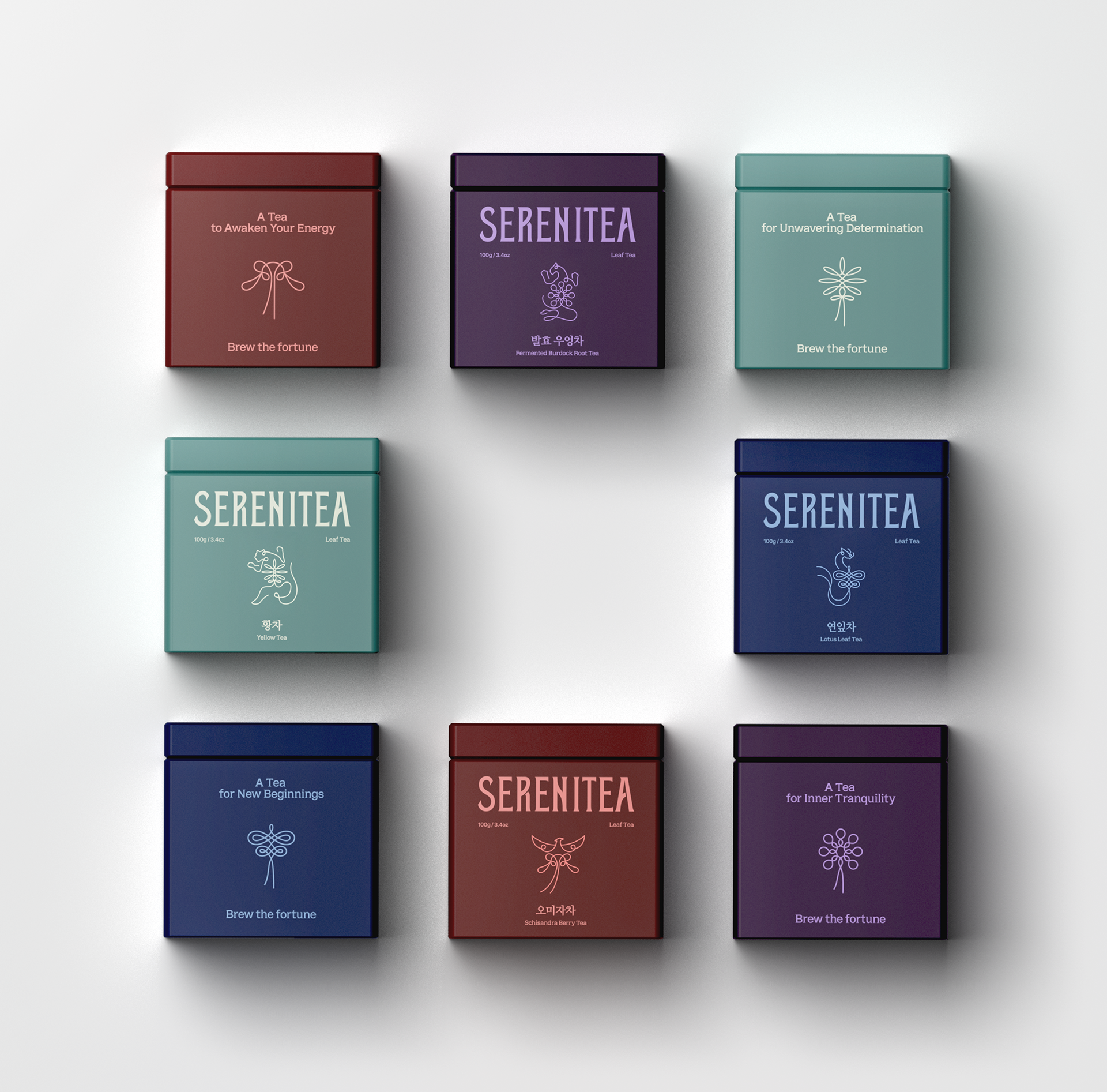 The design of SERENITEA began with the intention of reinterpreting the calm and symbolic nature of traditional Korean tea culture through a contemporary lens. Inspired by the mythology of the Four Guardian Spirits, the visual system expresses the unique energy and symbolism of each tea while framing tea drinking as a quiet everyday ritual. Traditional patterns and symbolic colors were translated into a modern graphic language to shape the brand identity, creating a visual experience that conveys moments of balance and tranquility through a cup of tea.