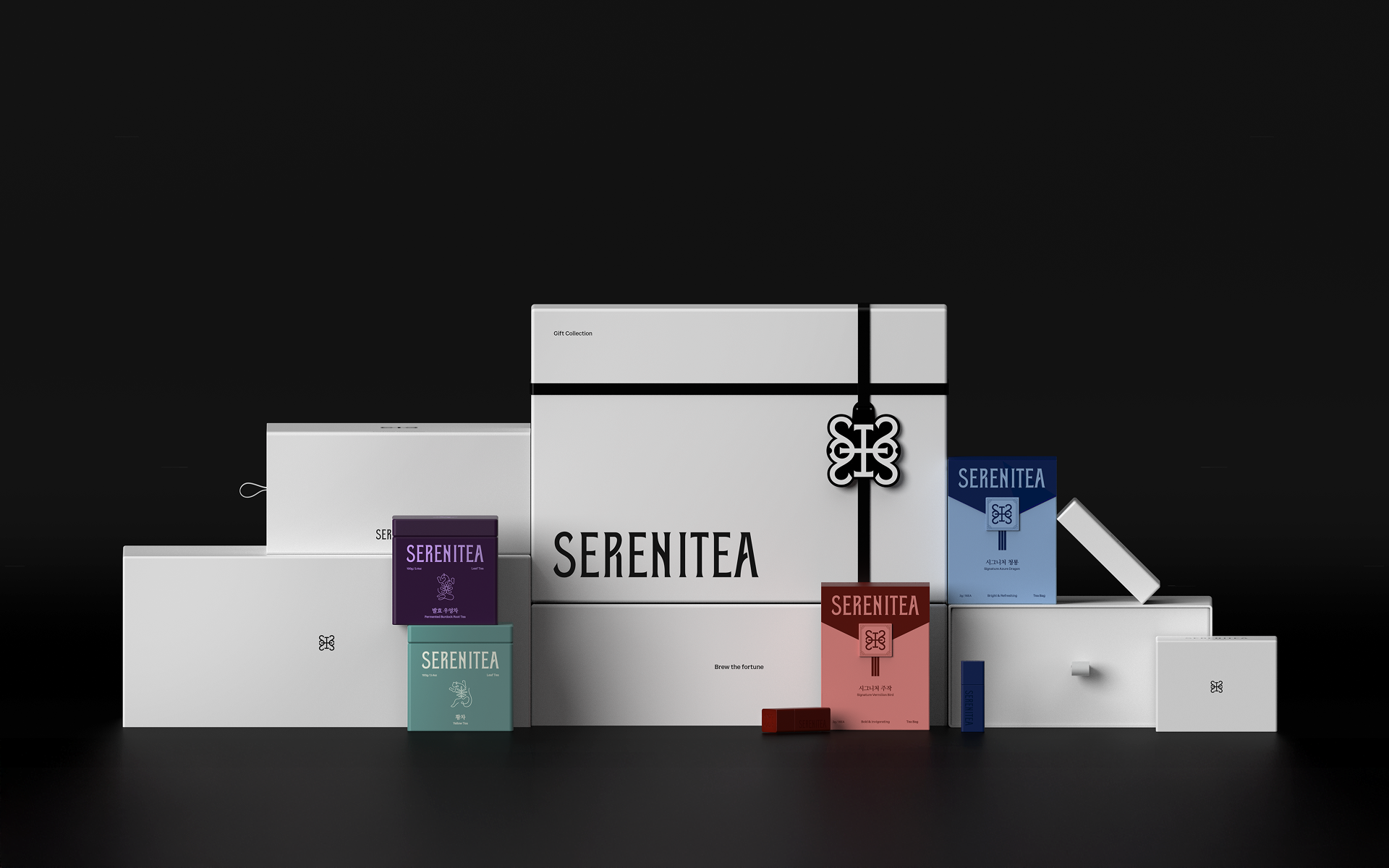 SERENITEA의 디자인은 한국 전통 차 문화가 지닌 고요한 분위기와 상징적 의미를 현대적인 감각으로 재해석하는 데서 출발했습니다. 사방신의 세계관을 모티프로 삼아 각 차가 지닌 기운과 상징성을 시각적으로 표현하고, 차를 마시는 시간을 일상의 작은 의식처럼 느낄 수 있도록 브랜드 경험을 설계했습니다. 전통 문양과 색의 상징성을 현대적인 그래픽 언어로 정리해 브랜드 아이덴티티에 담아냈으며, 차 한 잔을 통해 평온과 균형을 경험하는 순간을 시각적으로 전달하고자 했습니다.
